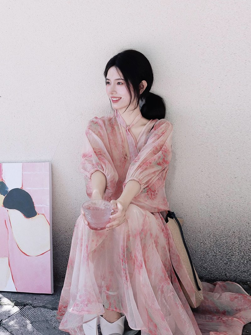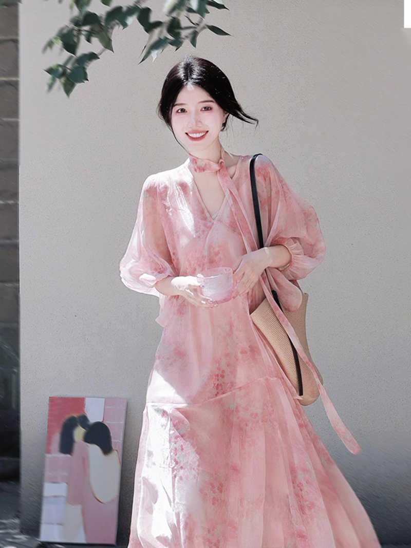 法式粉色不规则吊带连衣裙多巴胺绝美沙滩裙