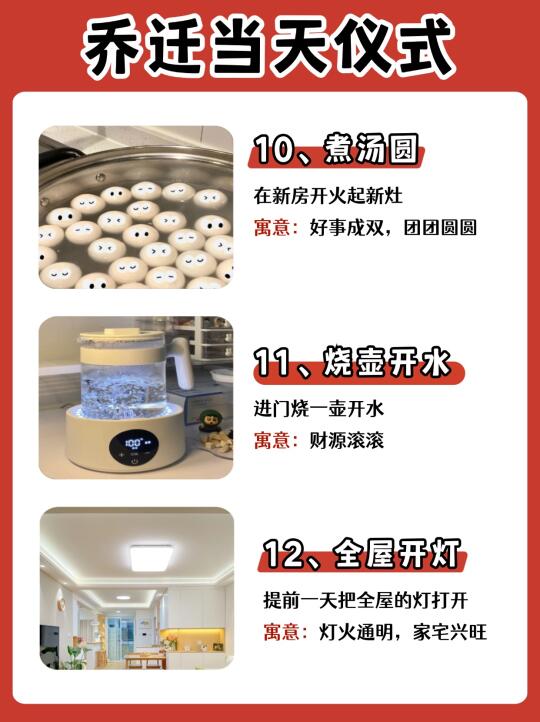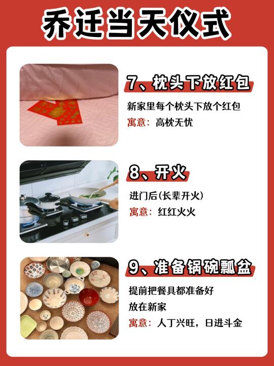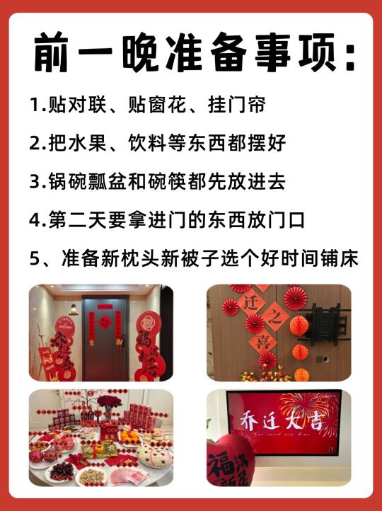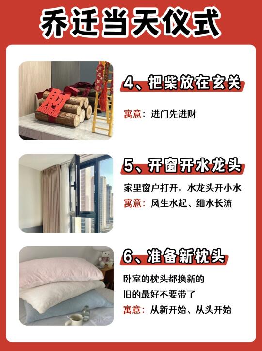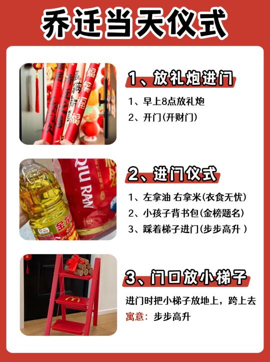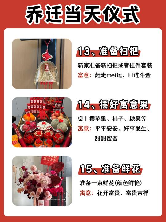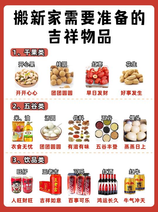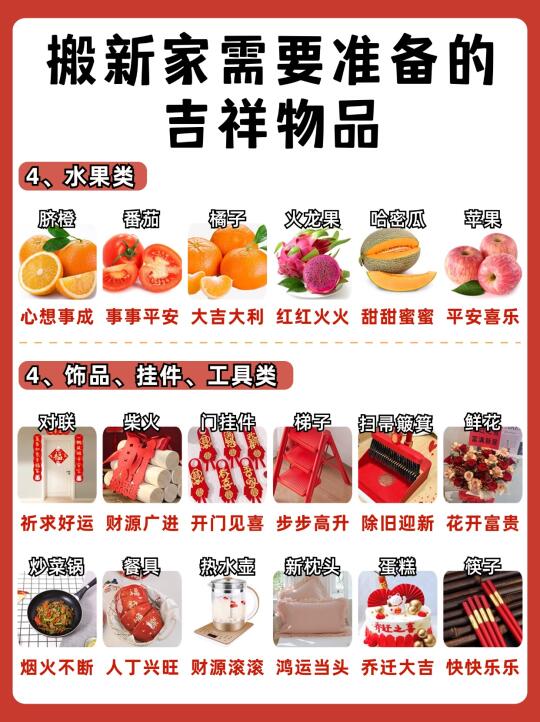 乔迁新居是一件很开心的事情~🎉当然仪式感也不能少,搬新家带好运🔥日子才能人旺财旺,幸福美满! ✅需要准备的物品及乔迁仪式都有哪些? 橙子给大家整理出来了,打算乔迁的朋友马住了!! —— ⭐桌面准备 鲜花:花开富贵 可乐:可口可乐 旺仔:生活旺旺 花生:好事花生 红枣:早日发财 桂圆:团团圆圆 果酒:长长久久 苹果:平平安安 橙子:心想事成 葡萄:紫气东来 五谷:五谷丰登 红包:财源滚滚 摆件:福满新居 开心果:开开心心 火龙果:红红火火 哈密瓜:甜甜蜜蜜 -