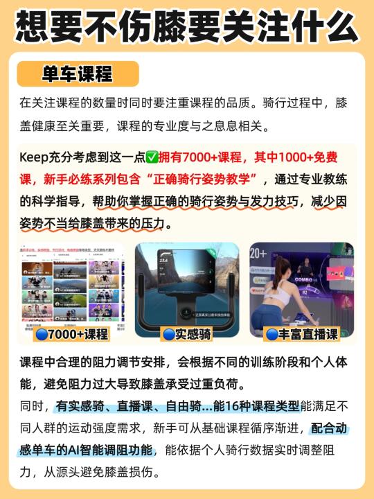 keep动感单车充分考虑到这一点🔍拥有7000+课程,新手必练系列还包含“正确骑行姿势教学”,这可不只是简单的带你骑车,还能帮你纠正骑行姿势。👉🏻实感骑、直播课、自由骑、系列课模式能够提升锻炼感受,趣味性和专业性并存,再配合动感单车的AI智能调阻功能,实时调整阻力🙅从源头避免膝盖损伤。其中免费课数量就有1000+,帮你低成本养成一个运动习惯
