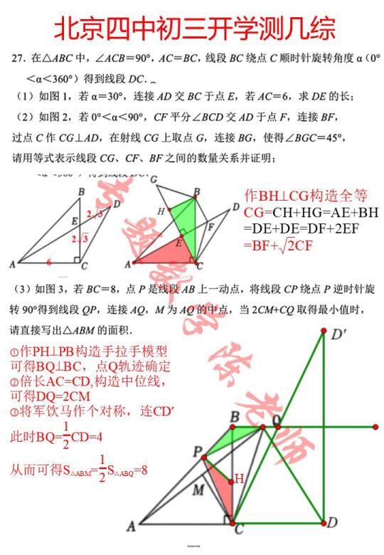 该题解题方法多样,涉及手拉手、一线三垂直、中点、8字等模型,以及瓜豆原理、将军饮马问题,几乎囊括北京地区最为重要的几大模型,堪称模型之集大成者,值得反复品味。若不收藏并多做几遍,着实有负命题老师的良苦用心。