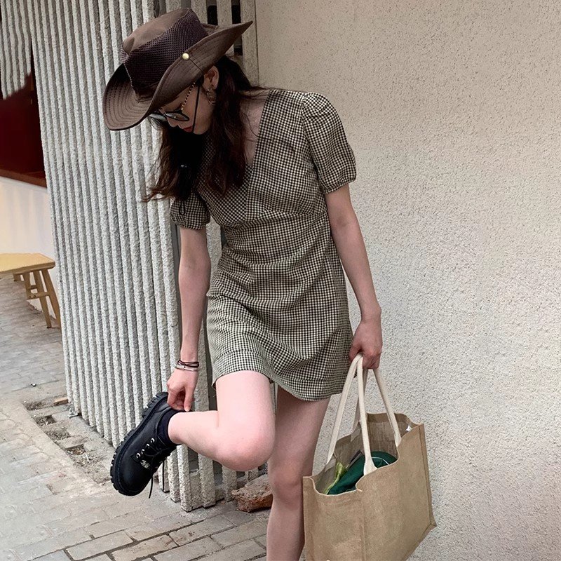 法式卡其色收腰a字连衣裙高级感超好看长裙