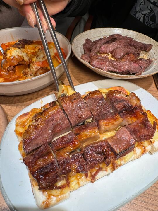 大行宫D9沿街的创意韩料店,和朋友来过很多次了,每次来都很喜欢。 - 手工年糕炒章鱼,年糕超级糯唧唧,辣辣的很开胃。苹果泡菜炖牛肉,牛肉炖的很软烂,奶奶的带着苹果的甜辣口感。炸牛排先炸后煎,七分熟刚好好。还有抹茶冰淇淋吐司,抹茶味特别浓。
