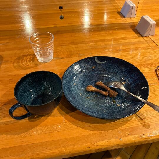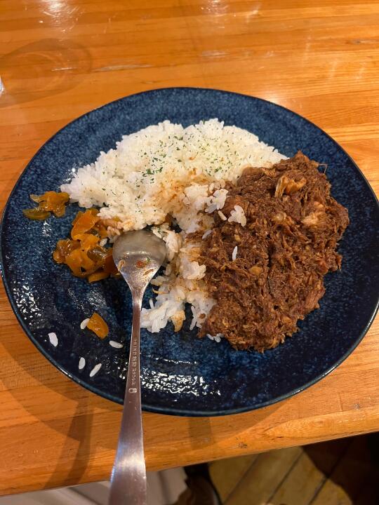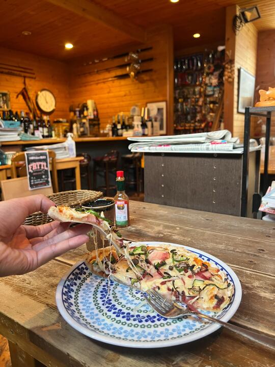 泡完汤后便出门寻觅晚餐,这一晚下起了超级大雪,兴奋的同时我在这遇到了村子里第二个很棒的地方,一家名叫Grass的餐厅,特色是干咖喱鸡肉饭,把咖喱与鸡肉混合在一起做得干干的,带一点辛辣味,超美味!可以看到我把整个盘子都吃光光了!在第二天我要离开这个地方时又来这里吃了一顿午餐,这回吃的是pizza,也很美味!店铺内的装修也非常漂亮,有许多酒瓶,还有滑雪与路亚的元素,店主应该是一位喜欢钓鱼的人,同时店内还有许多杂志可以翻阅,老板的审美超级在线!得知我是骑行游北海道后还赠予了我5个暖宝宝,感动到泪目