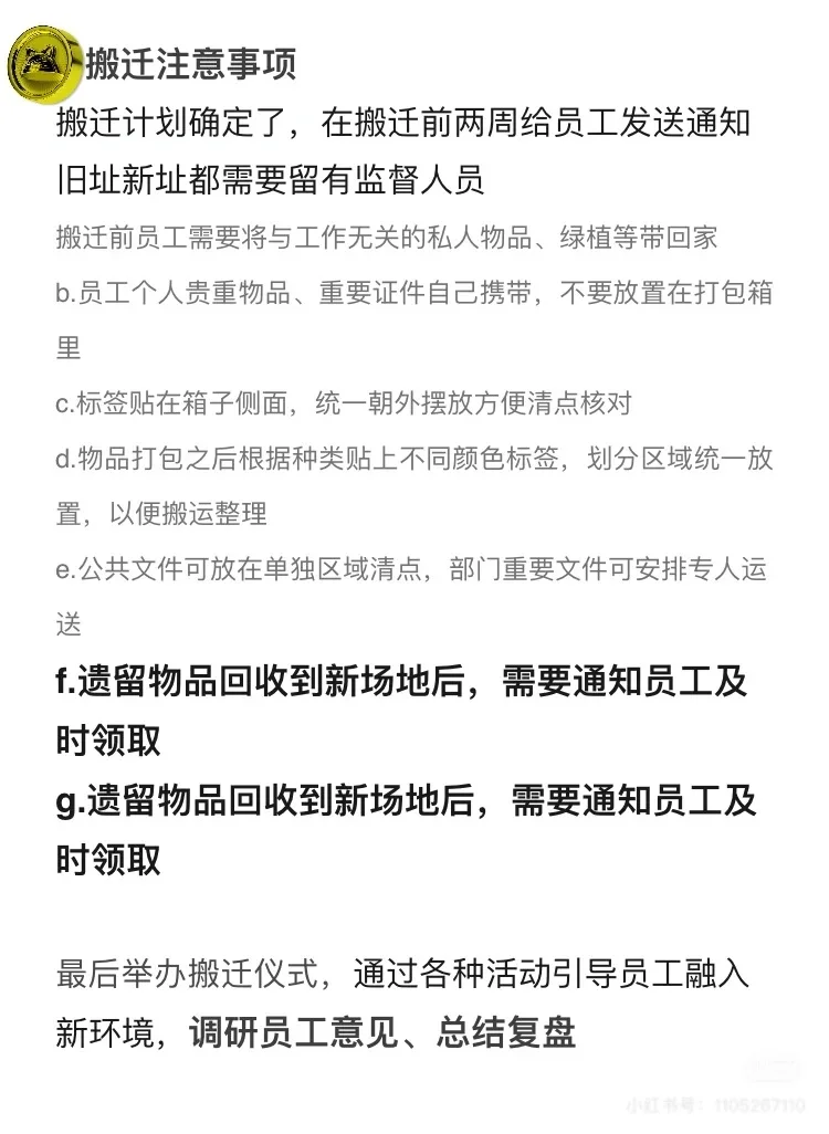 最后举办搬迁仪式,通过各种活动引导员工融入新环境,调研员工意见、总结复盘