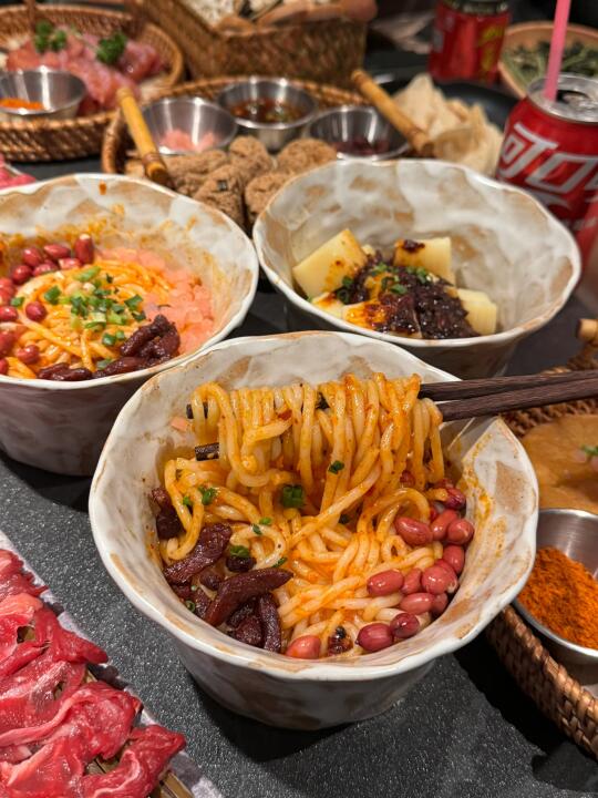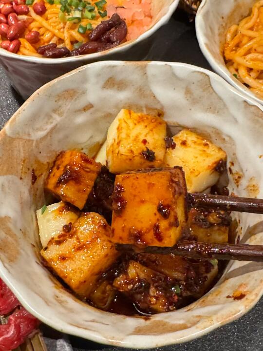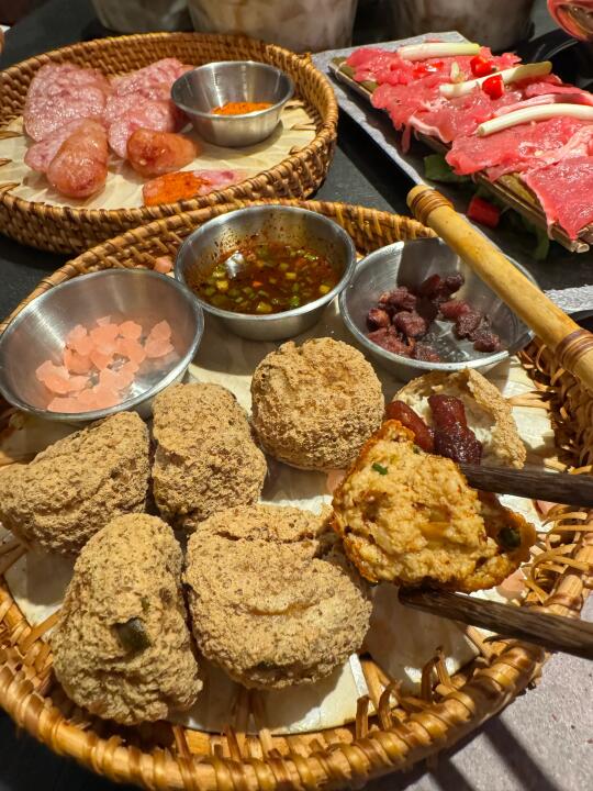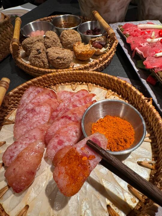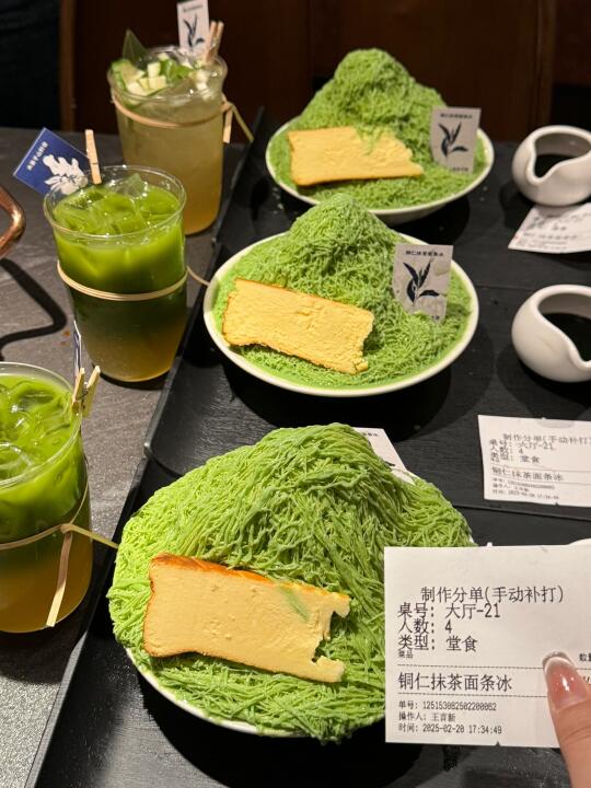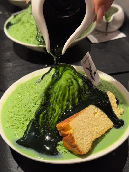 虹悦城新开的贵州酸汤火锅[搜索高亮]!!!竟然有济州岛同款抹茶雪冰➕芝士巴斯克,淋上抹茶酱超级浓郁。 - 他家酸汤锅底真的超级开胃,涮牛肉很入味。还有各种贵州小吃,贵阳糯米肠、脆哨洋芋粑粑、野菜糍粑…特别地方。