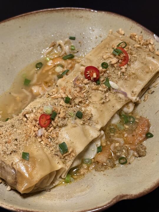 三鲜千张卷你还真别说,还有点意思,吃起来像蛋饺,四颗下来38,一颗9.5,一口让我可以坐八号线可以在车厢里要饭两个多小时。