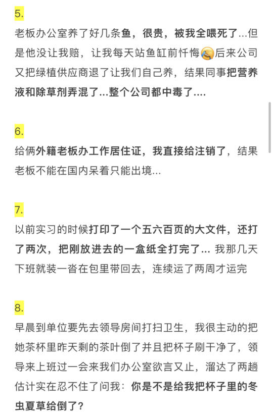 我左手拿着盆栽 右手拿着喷水壶给领导的盆栽喷水 刚好盆栽上有一根毛毛 我吹半天吹不掉 脑子一抽觉得拿着盆栽甩一下肯定能掉 结果盆栽里的小石头和土甩掉一地 还甩到了领导的桌子上 我俩面面相觑 沉默了5秒