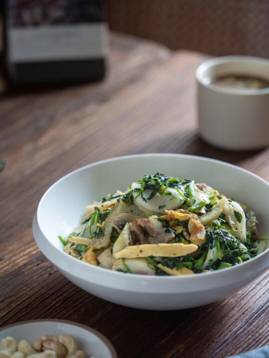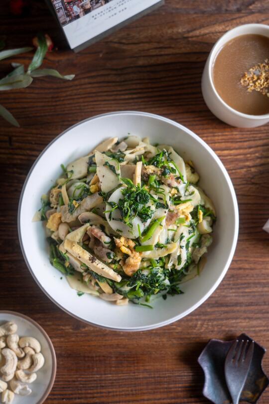 2、锅里下薄油,先煸笋,接着放口蘑、豆腐干、年糕翻炒片刻;