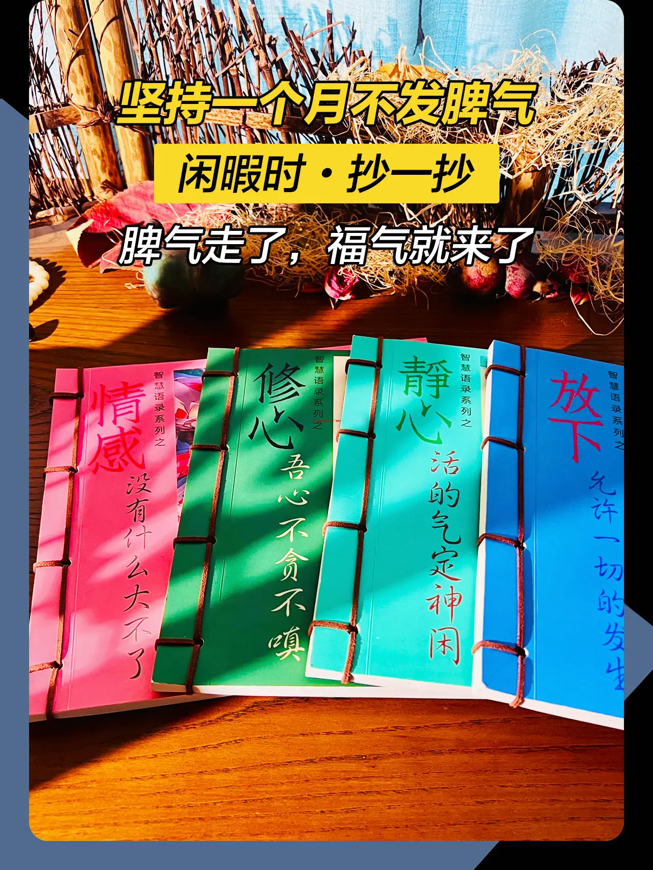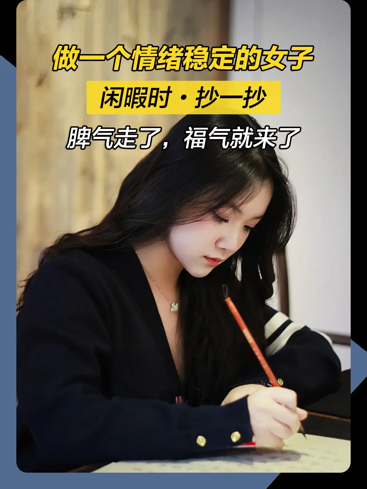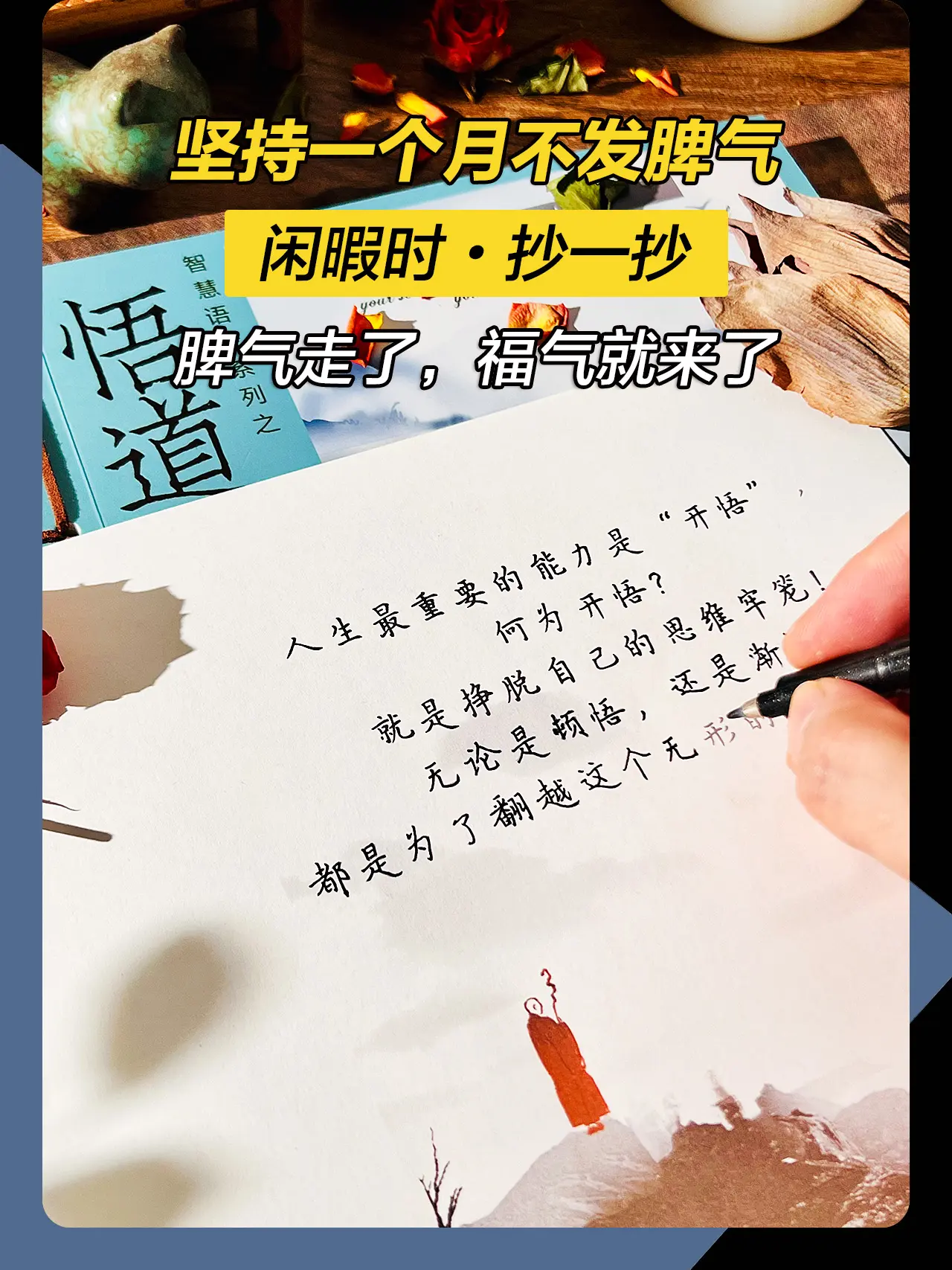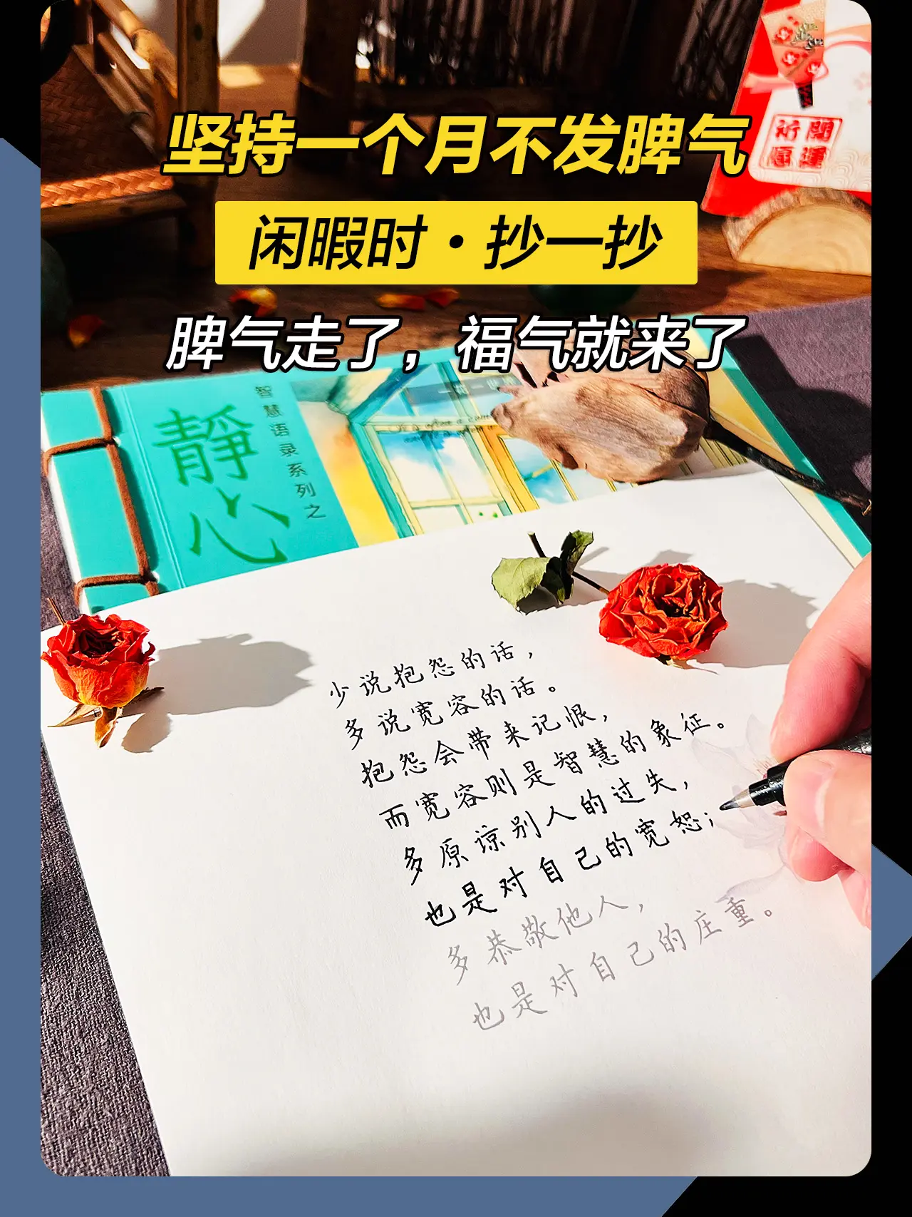 做一个情绪稳定的女子,别让你的脾气挡住了你的福气。少说抱怨的话,多说宽容的话,抱怨带来记恨,宽容乃是智慧,多原谅别人,会善待自己,多恭敬别人,会庄严自己。低谷烦躁的时候,不妨试着抄一抄,让内心静下来,能稳定情绪就不要内耗自己,不生气不焦虑,脾气走了,福气就来了。
