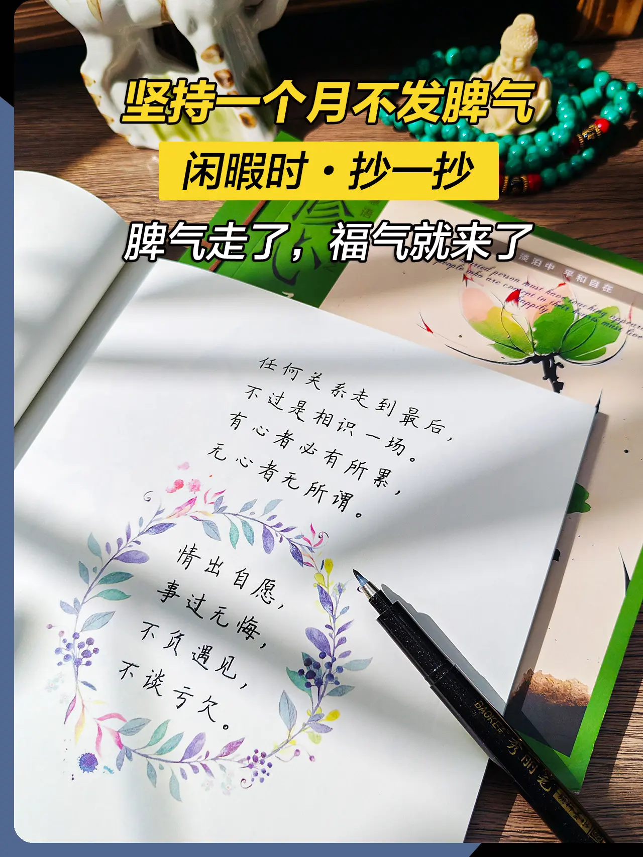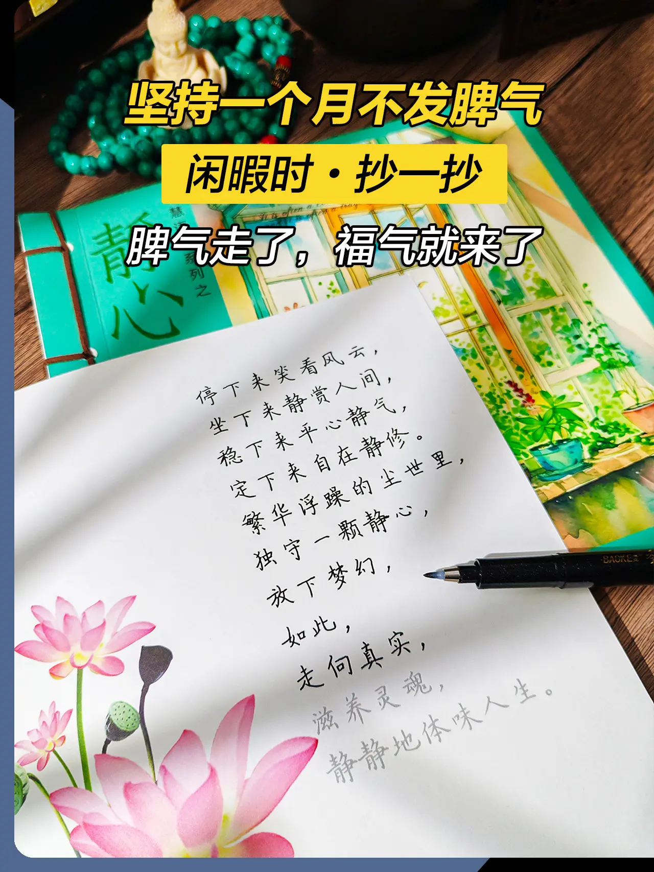 别让你的脾气挡住了你的福气!做一个情绪稳定的女子,低谷烦躁的时候,不要随意发脾气,不妨试着抄一抄写一写,让内心静下来,能稳定情绪就不要内耗自己,不生气,不计较,不焦虑,脾气走了,福气就来了。