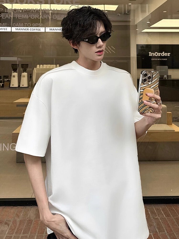 毛边牛仔拼接垫肩短袖男款夏季重磅小领口t