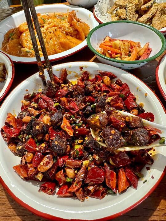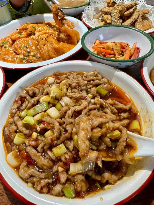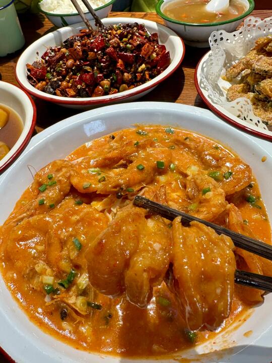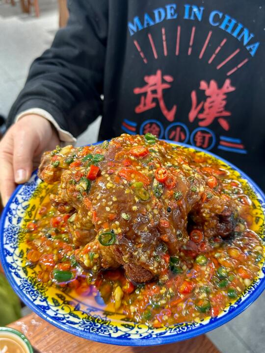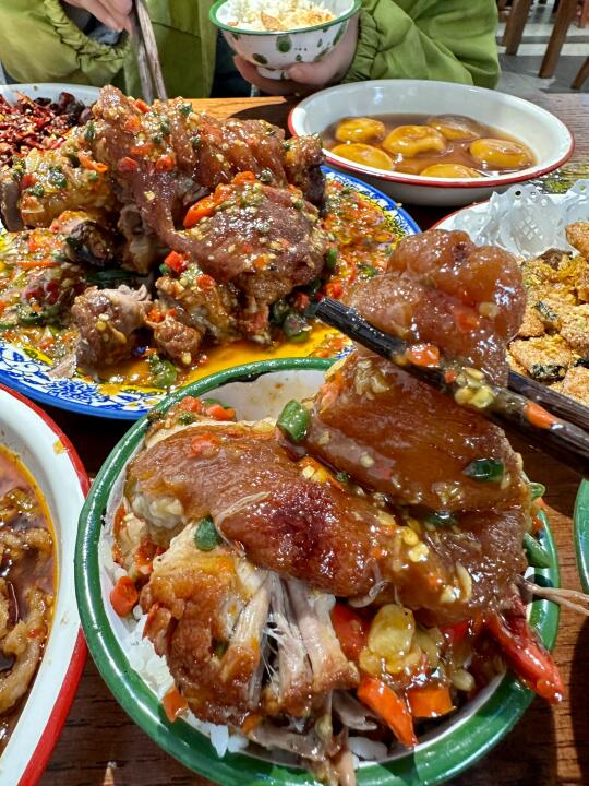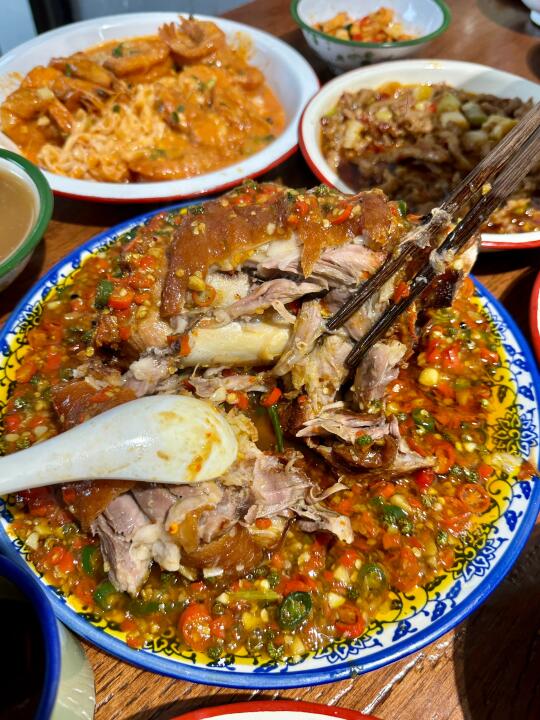 人均四、五十,好吃还不贵的川菜馆子! 每道菜都嘎嘎下饭!! 比脑阔还大的鲜椒肘子,Q弹软糯的肉皮入口真的ju香~肘子肉捣碎、和酱汁一起拌饭,三碗起步