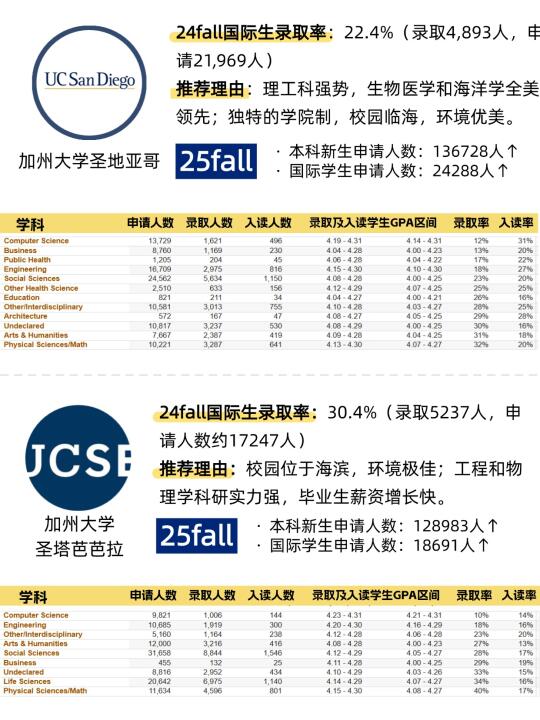 📚️最难录取TOP5:计算机科学、商科、公共卫生、工程、社会科学(生物医学和海洋学全美领先,产业合作紧密)