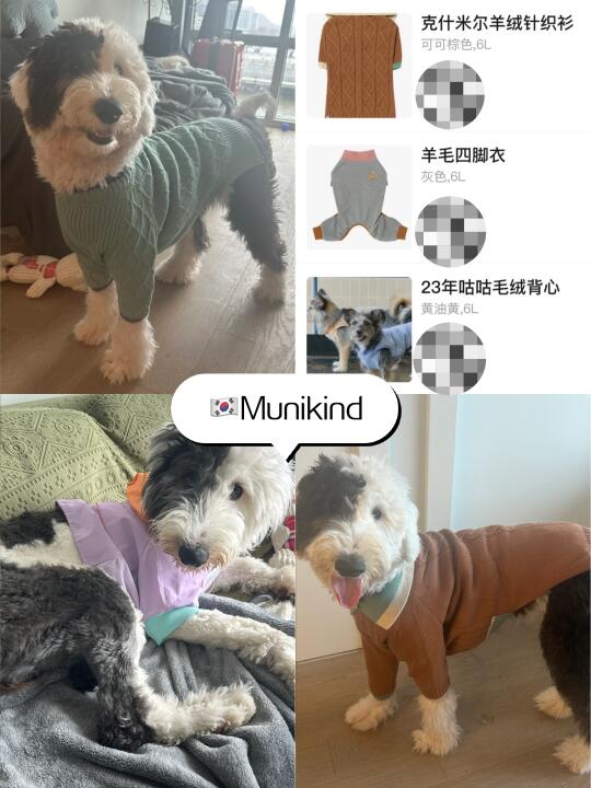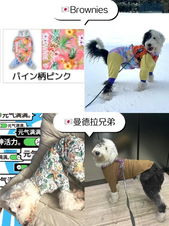 日韩牌子质量款式都好,就是价格高。Petparadise每季都有主题新款,质量好买不腻,和服太好看了。户外活动常穿Brownies(主打花里胡哨),Fov(这里面性价比最高的),Alphaicon(已退坑,价格虚高但质量不过硬,再也不想买了)。凹造型的话可选韩国牌子munikind(羊绒毛衣、羊毛四脚、毛背心都超好看)和puppygallery(性价比高)。打底衣很喜欢曼德拉兄弟家的,买了好几个颜色。