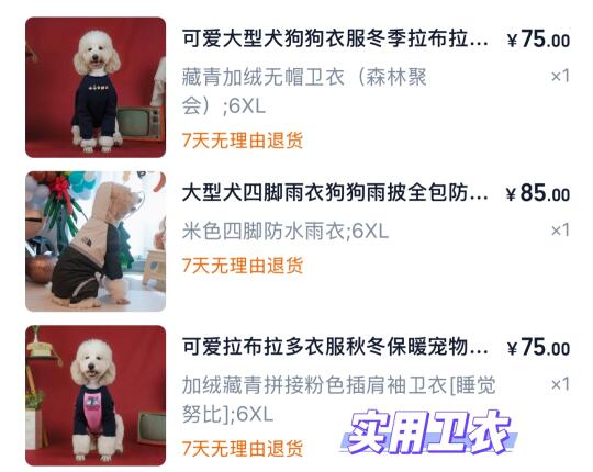 以上几家是多次回购店铺,偶尔看到其他尺码合适的也会买,比如专卖巨贵衣服的PunkDog,卫衣质量不错也很合身。小黄雨衣穿了好几年,容易穿脱,直接洗衣机洗不会坏。还有拍照穿过的酷女孩机车夹克,人见人夸。半喇柯基家定制唐装订完了没赶上过年,还在海上漂着。