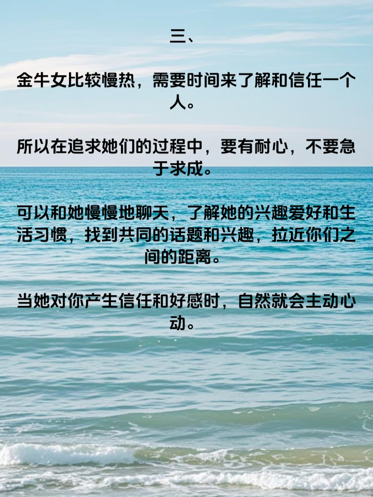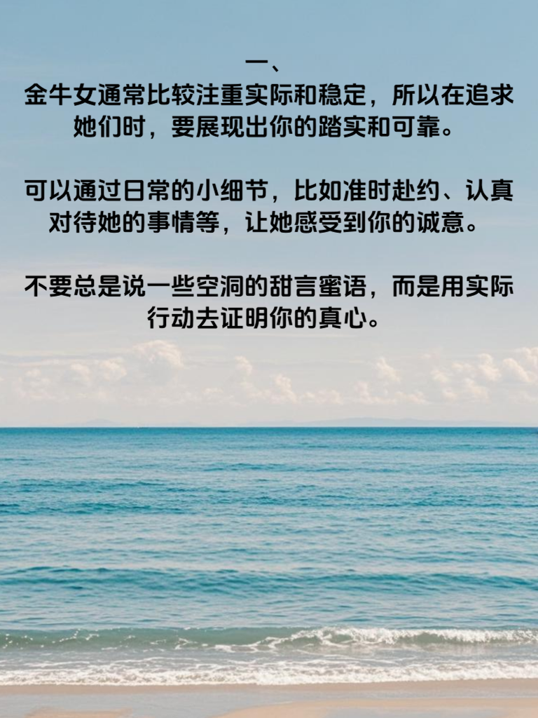 一、金牛女通常比较注重实际和稳定,所以在追求她们时,要展现出你的踏实和可靠。可以通过日常的小细节,比如准时赴约、认真对待她的事情等,让她感受到你的诚意。不要总是说一些空洞的甜言蜜语,而是用实际行动去证明你的真心。 二、金牛女对物质有一定的追求,但并不是只看重金钱。你可以带她去一些有品味的地方,一起品尝美食、欣赏艺术,让她感受到生活的美好。同时,也可以送她一些有意义的礼物,比如一本她喜欢的书、一件精致的饰品等,这些都会让她心动。 三、金牛女比较慢热,需要时间来了解和信任一个人。所以在追求她们的过程中,要有耐心,不要急于求成。可以和她慢慢地聊天,了解她的兴趣爱好和生活习惯,找到共同的话题和兴趣,拉近你们之间的距离。当她对你产生信任和好感时,自然就会主动心动。