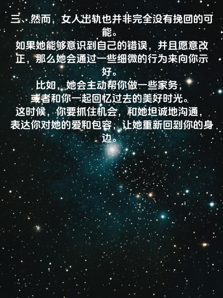 一、女人出轨后,往往会在行为上有所改变。她可能会突然变得比以往更加在意自己的形象,频繁地打扮自己,这其实是她内心不安的一种表现。她也可能会对家庭事务变得冷漠,不再像以前那样关心家人,因为她的心思已经不在家庭上了。 二、在情感方面,出轨后的女人会对你的关心和爱意变得迟钝。她不再像以前那样容易被你的小举动打动,甚至会对你的示好产生抵触情绪。这时候,你要试着去理解她的内心变化,不要强行去挽回,而是要给她时间和空间去思考。 三、然而,女人出轨也并非完全没有挽回的可能。如果她能够意识到自己的错误,并且愿意改正,那么她会通过一些细微的行为来向你示好。比如,她会主动帮你做一些家务,或者和你一起回忆过去的美好时光。这时候,你要抓住机会,和她坦诚地沟通,表达你对她的爱和包容,让她重新回到你的身边。