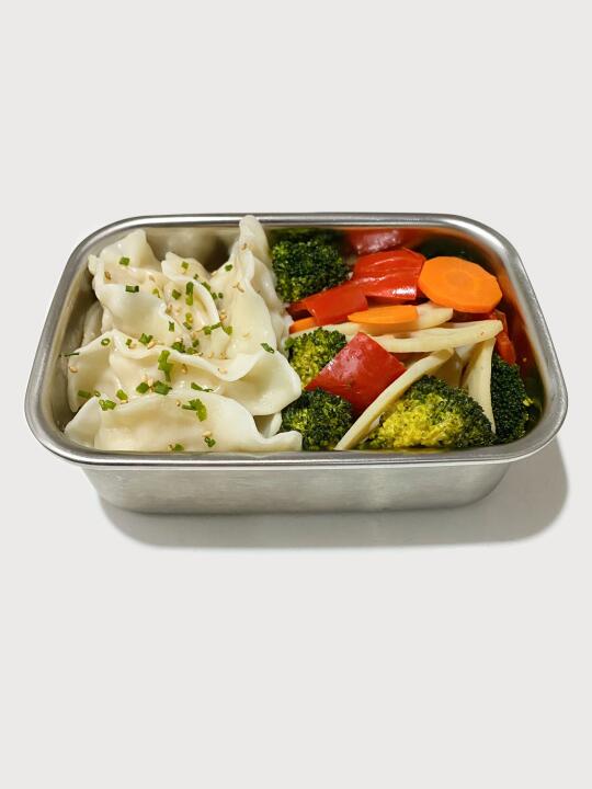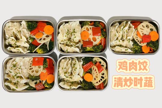 3️⃣ 将袁记黄金鸡肉饺和清炒时蔬分装入餐盒