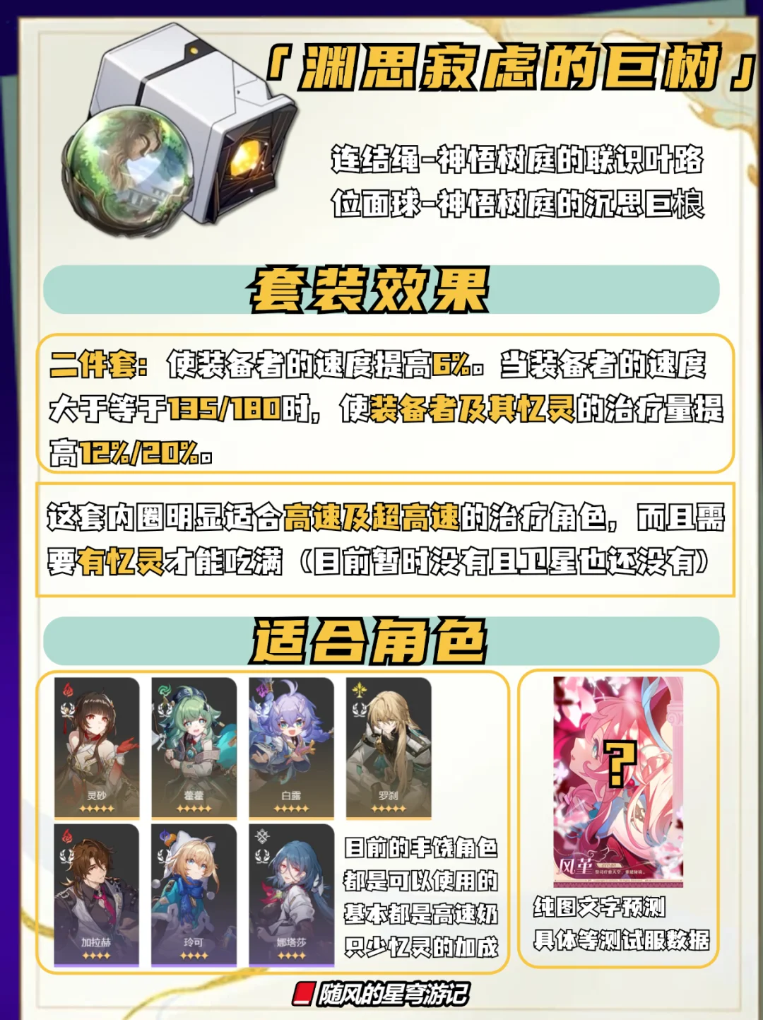 大家早上中午晚上好,我是随风 今天给大家带来的是星铁3.1新内圈前瞻攻略 「谧宁拾骨地」适合生命模型的记忆主C,目前能用的角色比较少,没有忆灵但血量高于5000,装备者也能吃到暴击伤害提高的加成,目前适合的有缇宝/万敌/刃,从外观来看推测是遐蝶的专属内圈 「渊思寂虑的巨树」适合高速和超高速治疗,目前的丰饶天团基本都能用(但吃不到忆灵的加成),后面应该会有一个记忆奶妈(从风堇的图配文里推测可能是她)