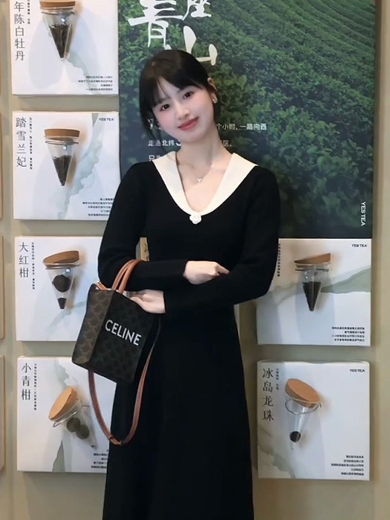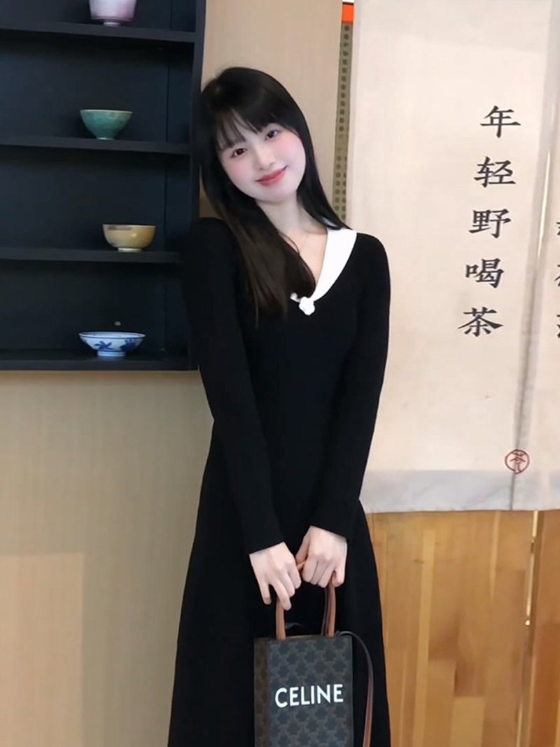撞色V领内搭针织连衣裙韩系收腰气质毛衣裙