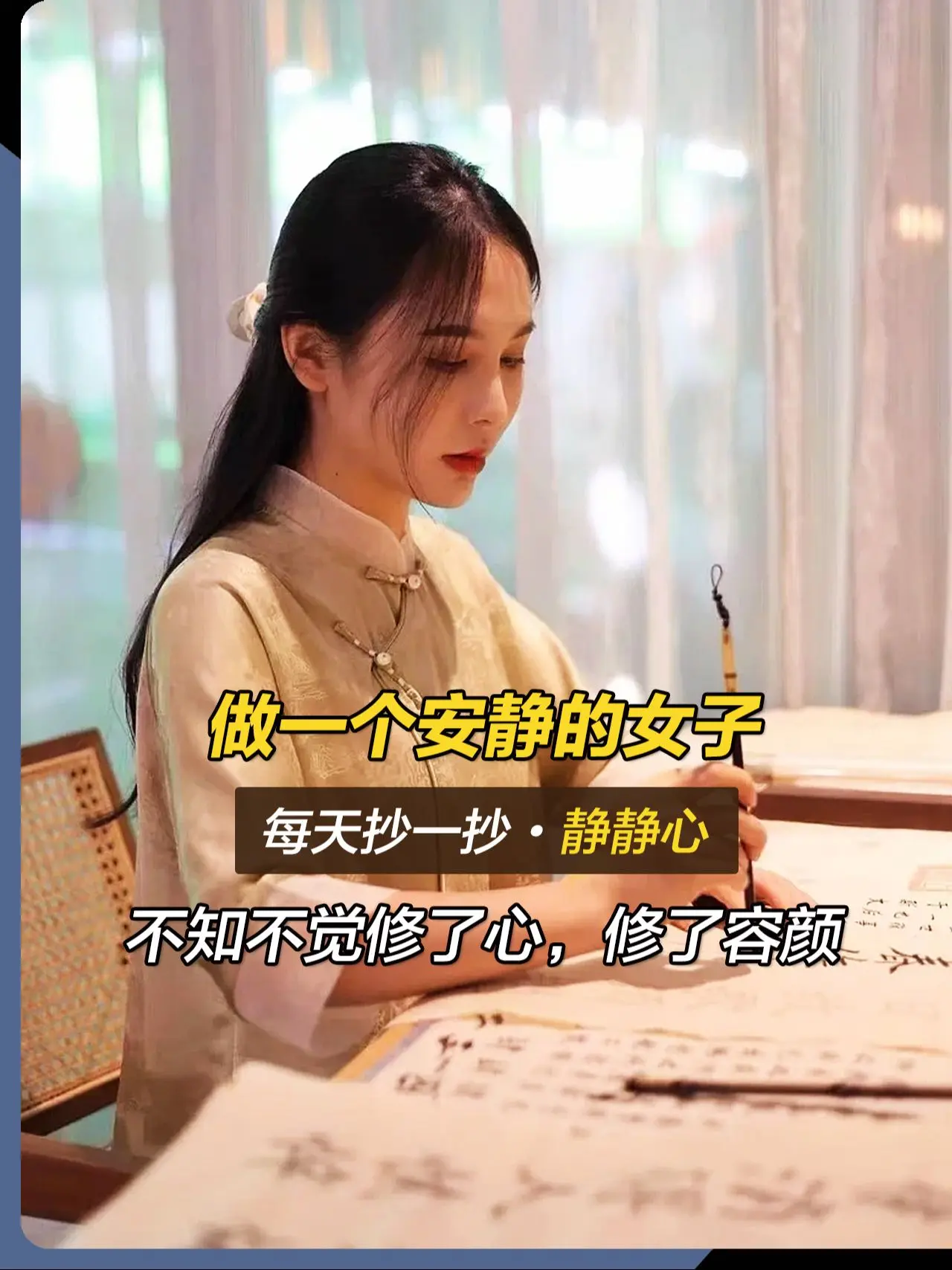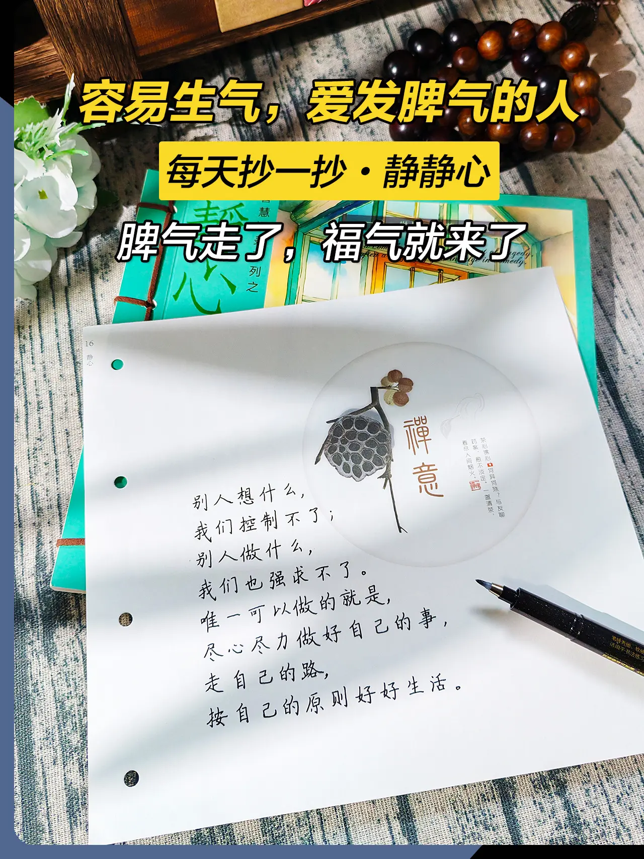 2025善待自己,从“静心”开始!做一个情绪稳定的女子, 别让你的脾气挡住了你的福气, 生活里谁伤害了你并不重要, 重要的是你自己是否 能够尽快化解自己的愤怒, 或者原谅,或者忘记,或者沉默。 心本自静,何须外求, 修行在心,不贪不嗔。 低谷烦躁的时候, 不妨试着抄一抄,静静心, 能稳定情绪就不要内耗自己, 不计较,不生气,不焦虑, 脾气走了,福气就来了。