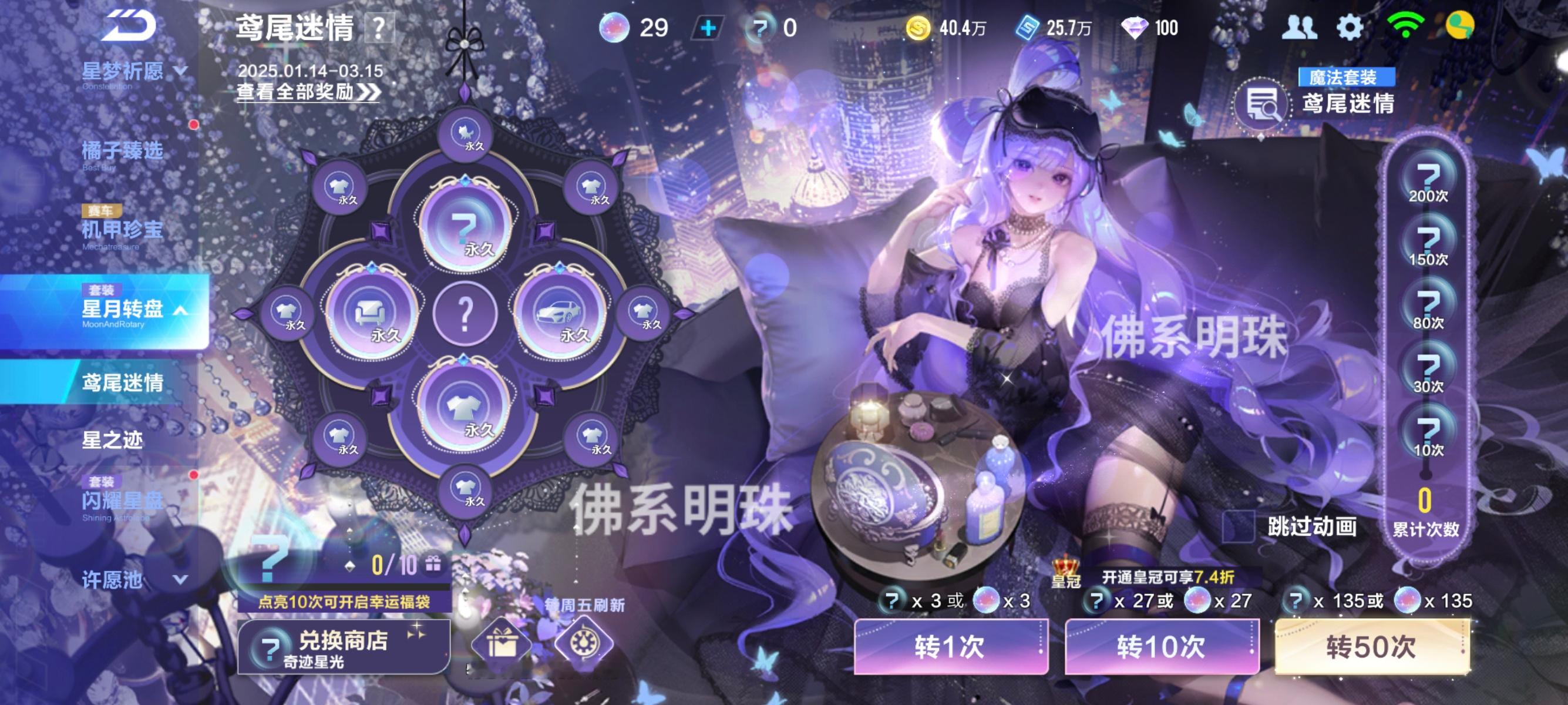 鸢尾迷情魔法套装宣传图和抽奖界面,获取方式为星月转盘升级版。海报很性感[doge] qq飞车手游 新年游好运 佛系明珠[超话]