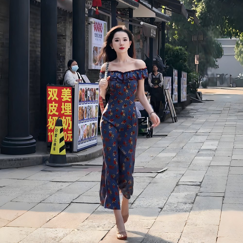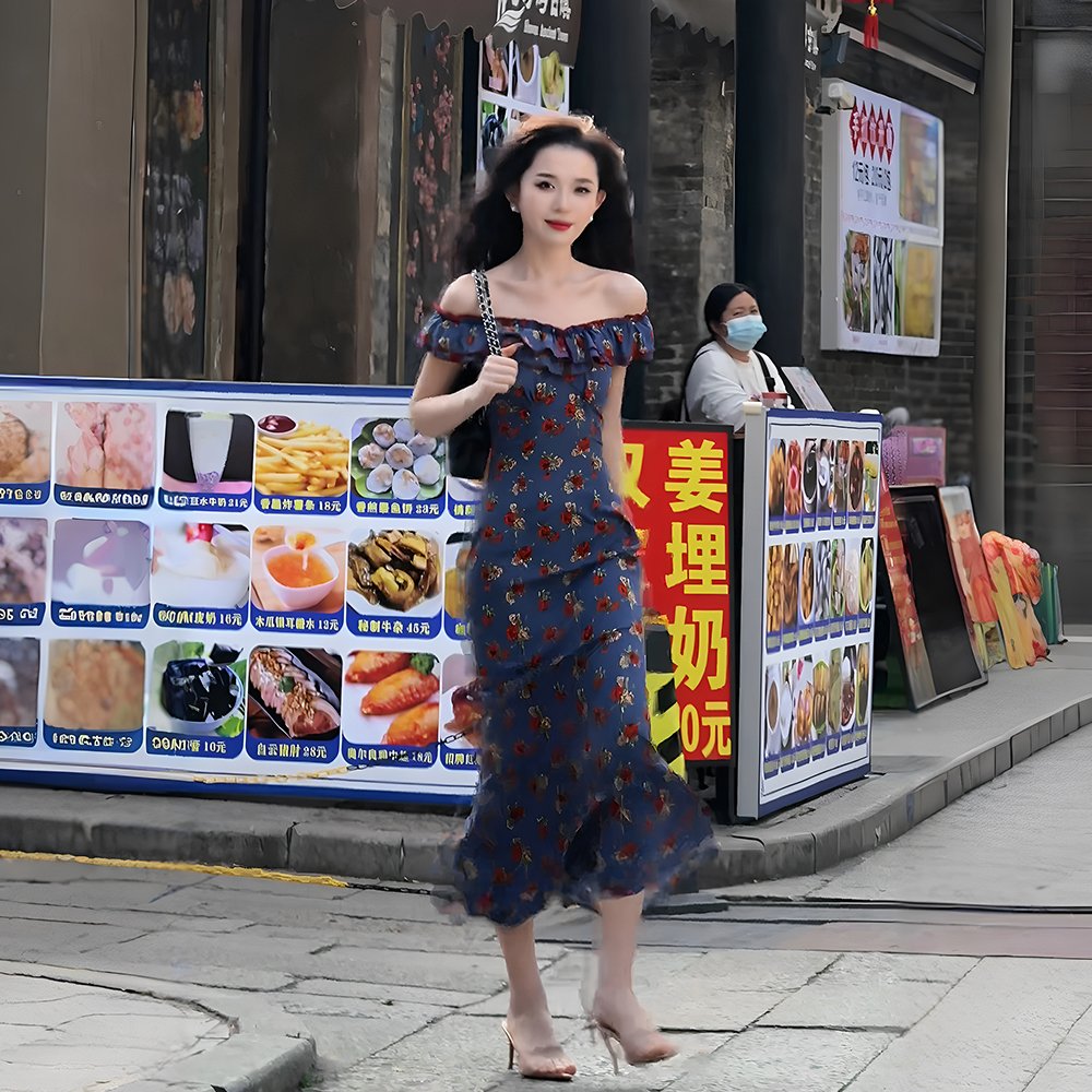 法式穿搭一字领碎花连衣裙气质收腰显瘦长裙