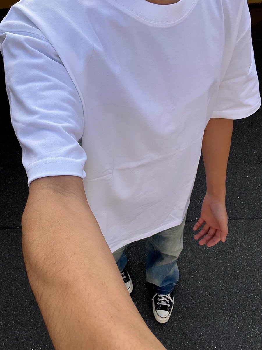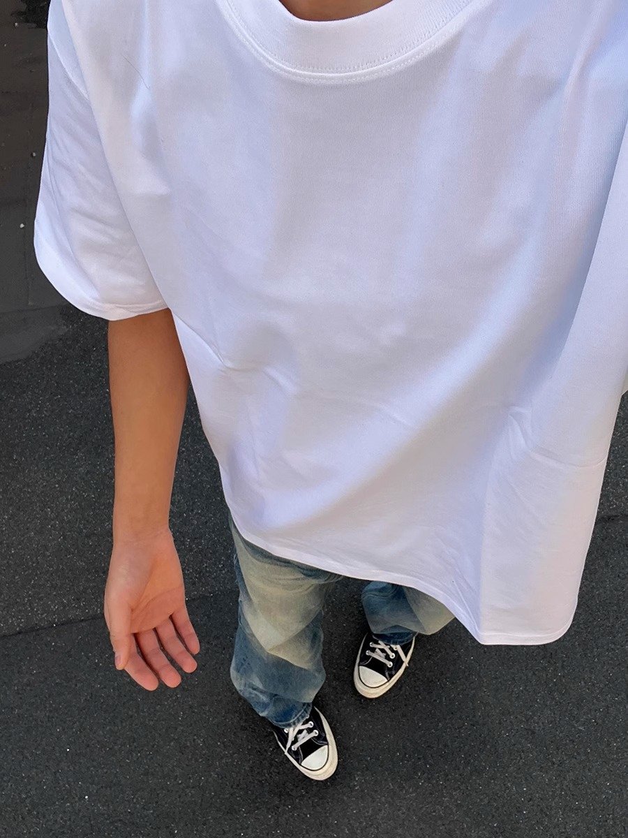 毛边牛仔拼接垫肩短袖男款夏季重磅小领口t