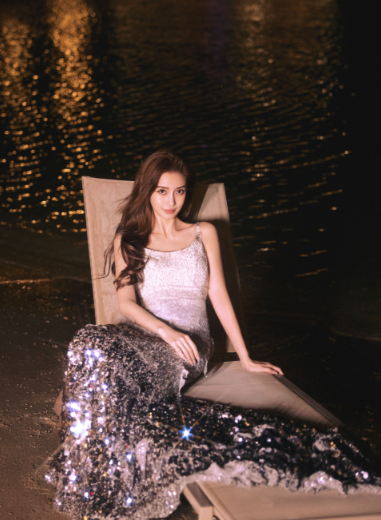 在拍摄场景的选择上,也非常巧妙🎬。背景是波光粼粼的水面,与杨颖的银白闪光裙相得益彰,营造出了一种梦幻般的氛围。她坐在岸边的躺椅上,海风轻轻吹拂着她的头发,画面唯美极了🌈,就像一幅美丽的画卷展现在我们眼前。
