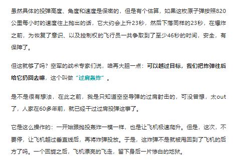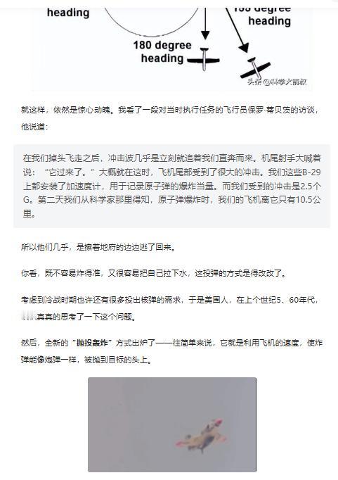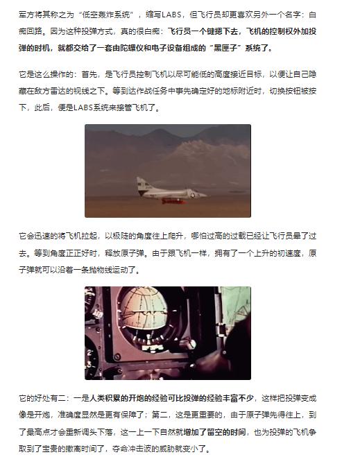 越肩轰炸,你可能不曾听说过的奇葩轰炸方式,它是怎么来的? 冷战的阴霾笼罩下,军事技术的创新达到了前所未有的高度,美军为应对核战争的可能性,开发出了一系列令人惊叹的投弹技术。 传统的高空投弹和俯冲轰炸因准确性和安全性问题不再适用于核武器,于是"战术甩投核弹"应运而生。 这项技术包括向前甩投和越肩甩投两种方式,飞行员需要在极端条件下操控飞机,将核弹精准投放至目标区域。然而,这种方法对飞行员和飞机都构成巨大挑战。 为此,美军又研发了“低空轰炸系统”(LABS),通过自动化控制系统接管飞机,在低空高速飞行后突然拉升,将核弹如炮弹般抛向目标。 更为大胆的“过肩轰炸”技术则让飞机几乎完成一个筋斗后向后投弹,这种极限操作虽然能为飞行员争取更多逃离时间,却也给飞机结构带来巨大压力。 随着精确制导技术的发展,这些复杂的投弹方式逐渐退出历史舞台。然而,它们所体现的技术突破和战略思维,仍然是那个时代军事创新的生动写照。更多优质深度好文可到-h5/quality-list?enter_from=erchuang榜单阅读