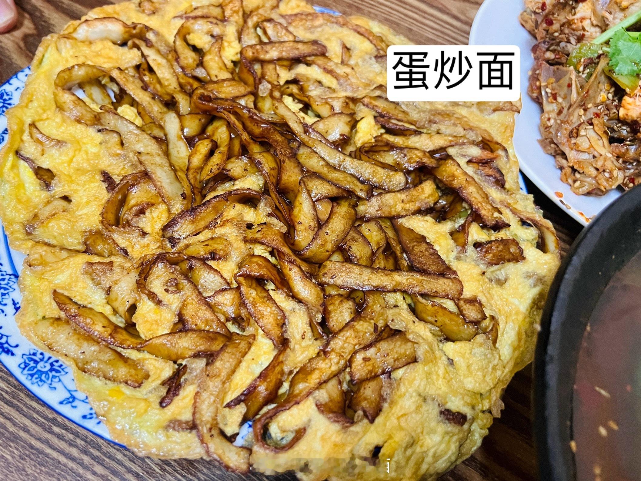 ❤️【蛋炒面】——就是那个圆圆的鸡蛋饼,就是沈阳的老味蛋炒面!是用刀削面炒的,鸡蛋液全部盖在了面上,太香了~~ 这个面是本次的意外收获。