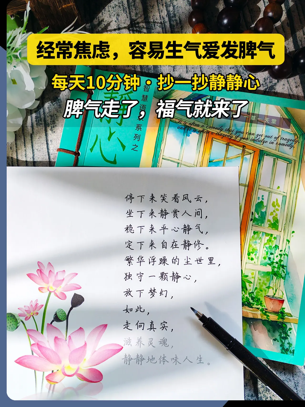 做一个安静的女子, 别让你的脾气挡住了你的福气! 停下来,笑看风云; 坐下来,静赏花开; 沉下来,沉静如海; 定下来,静观自在。 少说抱怨的话,多说宽容的话, 抱怨带来记恨,宽容乃是智慧, 多原谅别人,会善待自己, 多恭敬别人,会庄严自己。 低谷烦躁的时候,抄一抄静静心, 脾气走了,福气就来了。