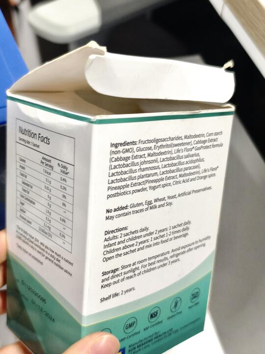三个里面唯一的国货哈哈,存储包装很用心。里面有6种肠道菌和6种益生元,活菌数添加400亿,也有1个安全认证。每天中午饭后直接到嘴里喝口水咽了就行,一千多囤了三盒吃了两个月,排泄是不错的。