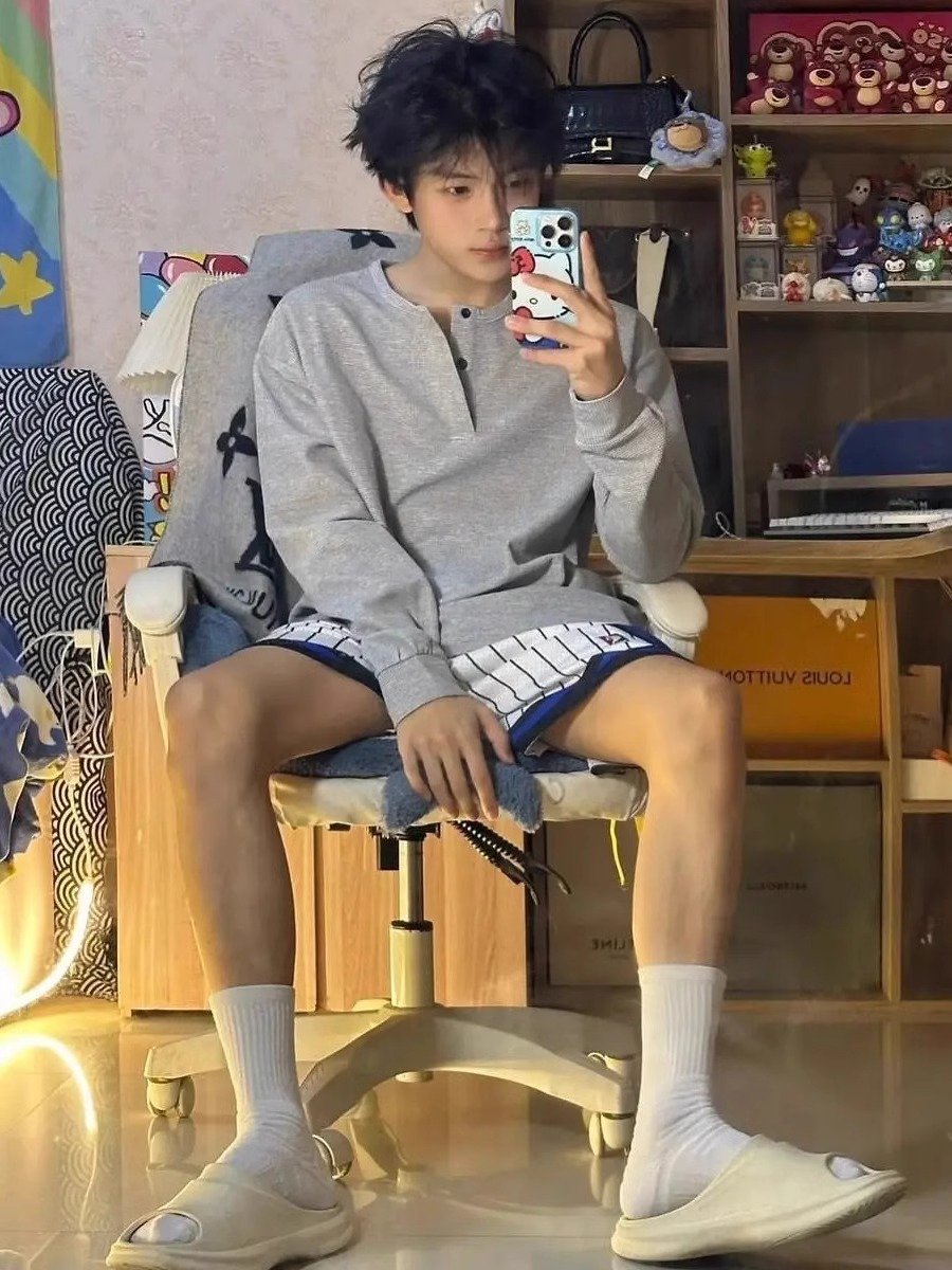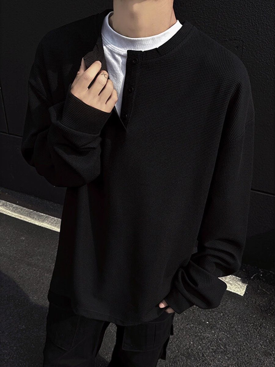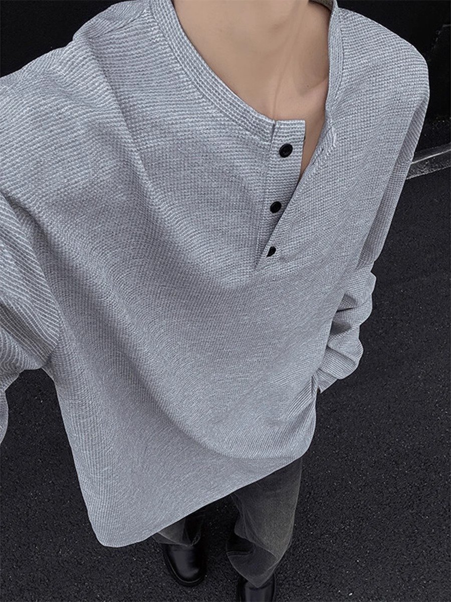 浅灰色亨利领长袖t恤男夏季高级感慵懒风打