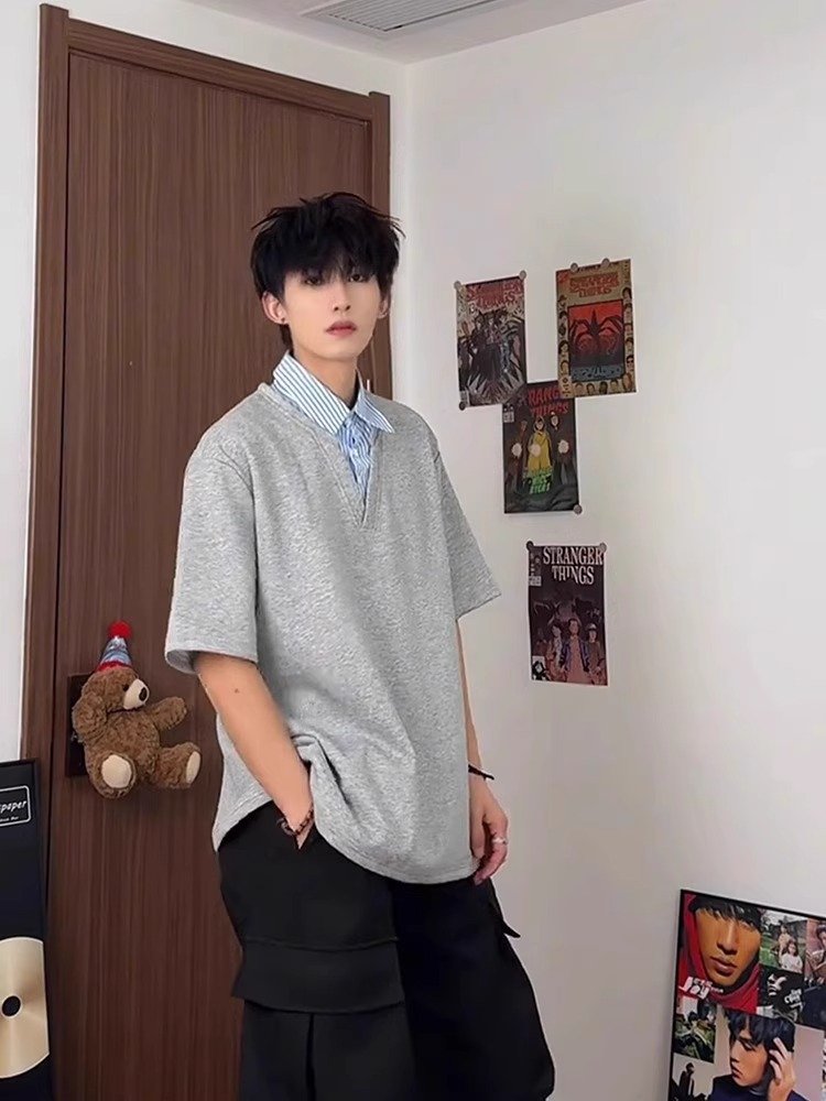 花灰色假两件拼接短袖男款夏季条纹v领重磅
