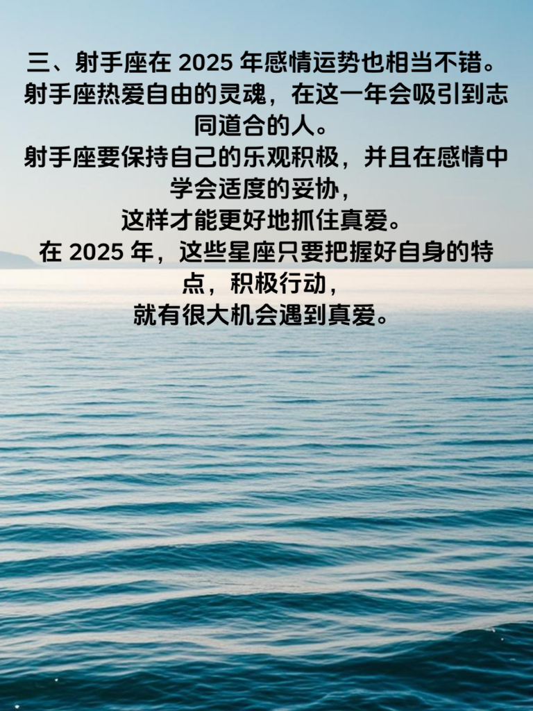一、2025年,据说有些星座将迎来感情的大突破,易遇真爱。对于白羊座来说,他们的热情与活力在2025年仿佛是吸引真爱的磁石。白羊座在这一年要勇敢地表达自己的情感,不要害怕被拒绝,这是遇到真爱的关键干货。 二、天秤座在2025年也有很大的机会。天秤座的优雅与善解人意是他们的优势。在这一年,天秤座要多参加社交活动,扩大自己的交际圈,因为真爱可能就在那些新结识的人群之中。 三、射手座在2025年感情运势也相当不错。射手座热爱自由的灵魂在这一年会吸引到志同道合的人。射手座要保持自己的乐观积极,并且在感情中学会适度的妥协,这样才能更好地抓住真爱。在2025年,这些星座只要把握好自身的特点,积极行动,就有很大机会遇到真爱。