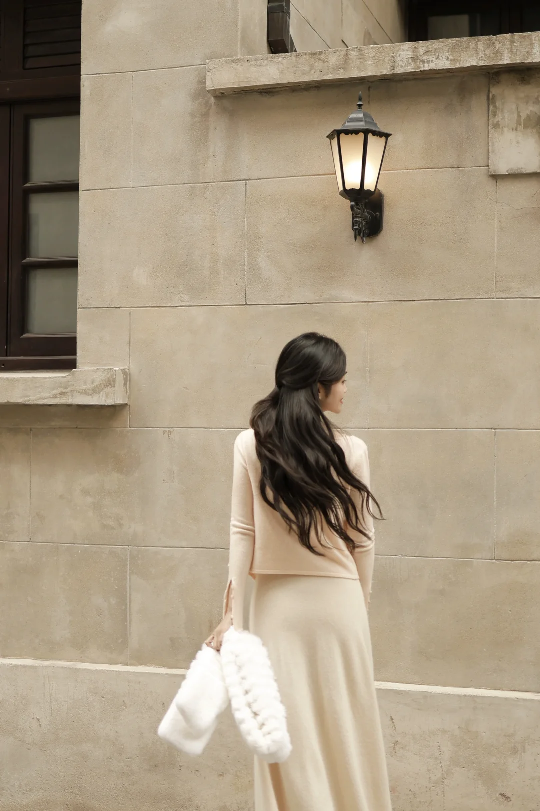 一位长相漂亮、身材出众的姑娘,穿上了一件对身材要求极高的紧身款一字肩粉色针织衫搭