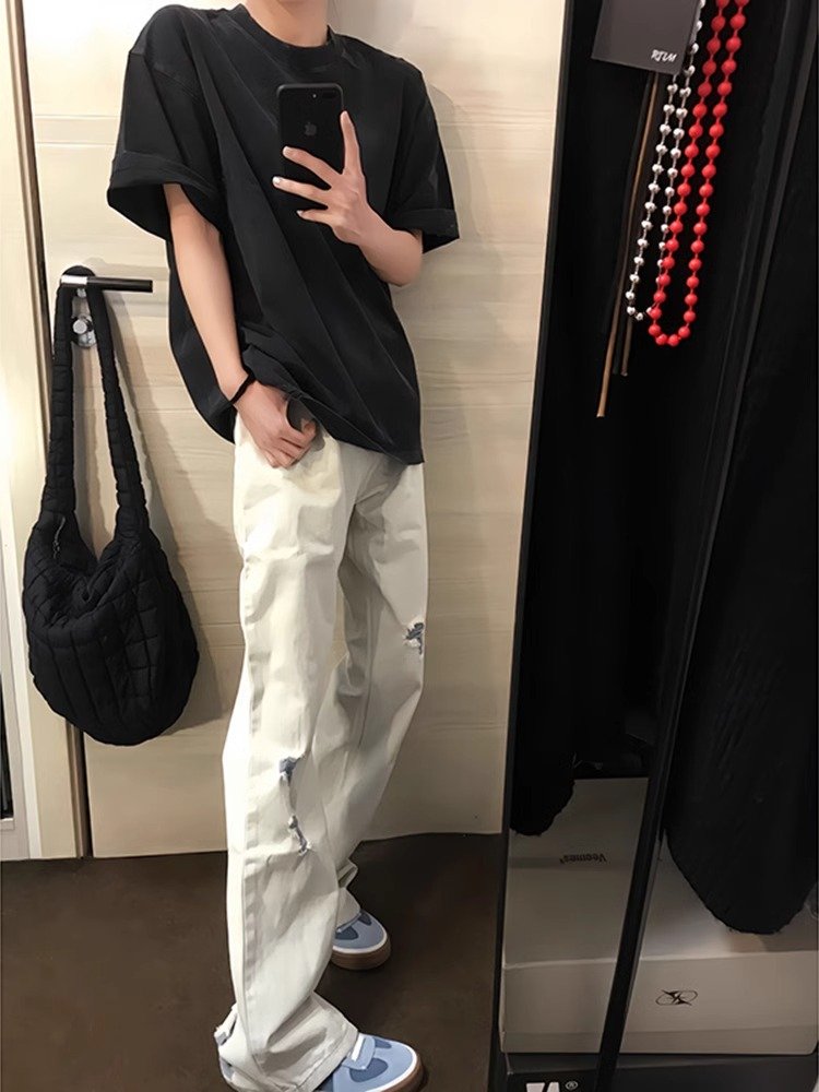 白色纹理感短袖男款夏季美式重磅设计感上衣