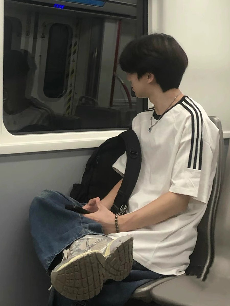 白色三条杠条纹短袖男夏季少年感穿搭小领口