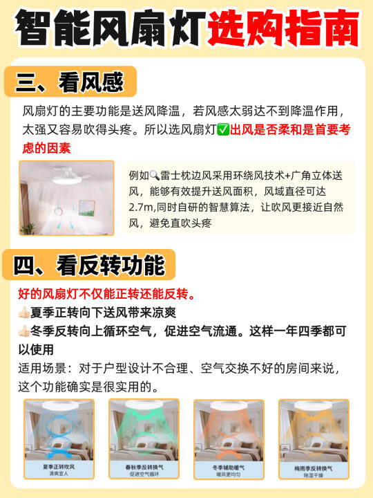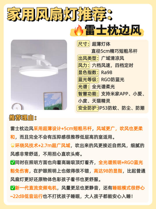 ⭐综合以上几大重点,我最后选择的是✔️雷士枕边风,采用超薄设计➕5cm短粗吊杆,环绕风技术+27m超广风域,风量更足也更静音!而且吹出来的风更接近自然风,不用担心直吹头疼~专为卧室设计的睡眠模式也超贴心😴晚上睡觉又舒服又安稳~