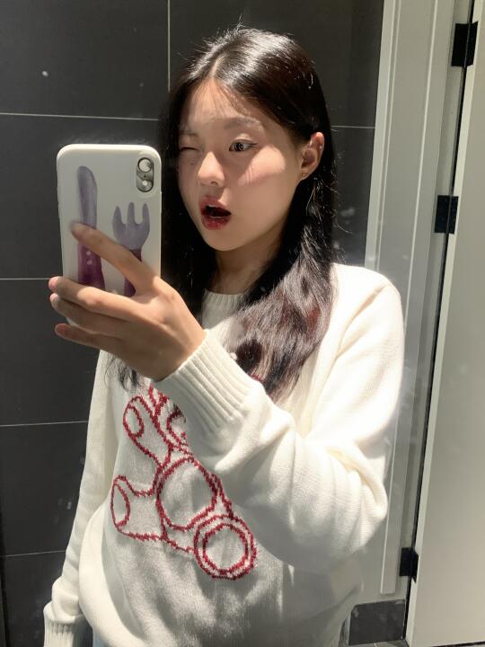 一位长相漂亮、身材出众的姑娘,穿上了一件对身材要求极高的紧身款一字肩粉色针织衫搭