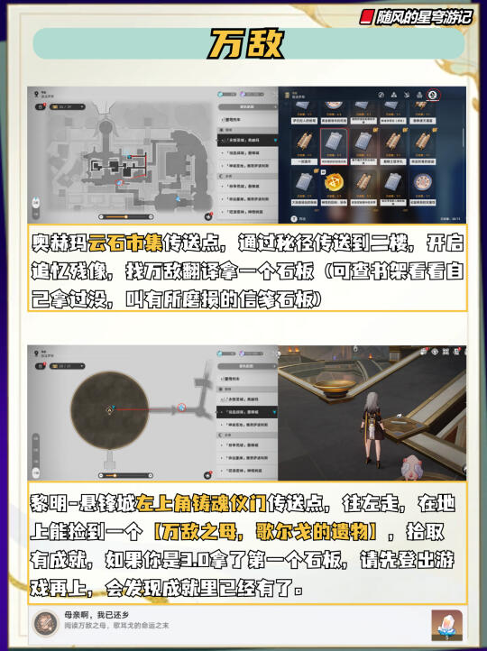 大家早上中午晚上好,我是随风 今天给大家带来的是3.1主线后七个黄金裔彩蛋及成就奖励攻略 包括风堇、那刻夏、万敌、白厄、遐蝶、阿雅、缇宝等角色,1个隐藏任务还有3个成就,记得不要错过哦!