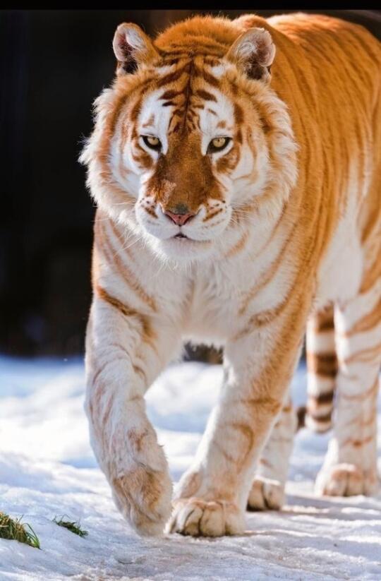 🍀金虎,也被称为黄金虎或孟加拉金虎,并非一个独立的物种或亚种,而是孟加拉虎的一种罕见金黄色变种。这种变种的数量比雪虎还要稀少,全身呈现出耀眼的金黄色,间杂着褐色的条纹。两肋的毛色略淡,而腹部则是一片洁白。金虎的诞生,源于孟加拉虎毛色控制的一个隐性基因发生了突变,进而导致毛发中黑色素的生成减少。最终,孟加拉虎的毛发整体呈现为金黄色,原本的黑色条纹也相应地变成了褐色。