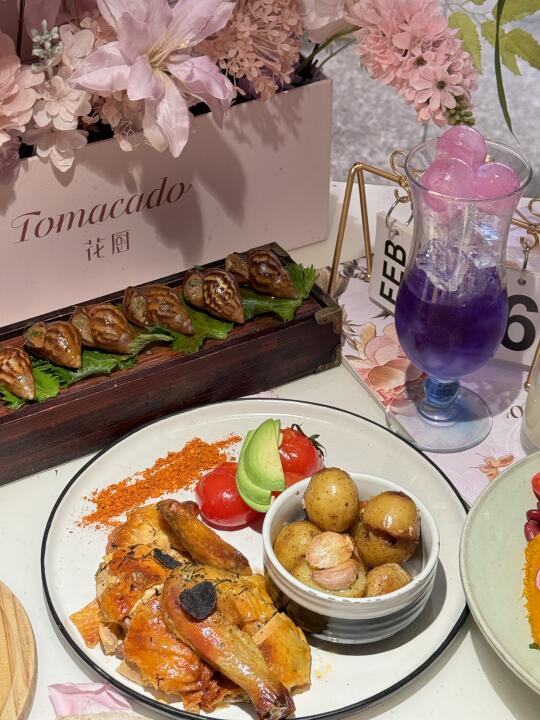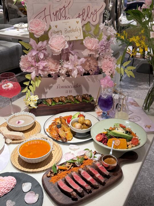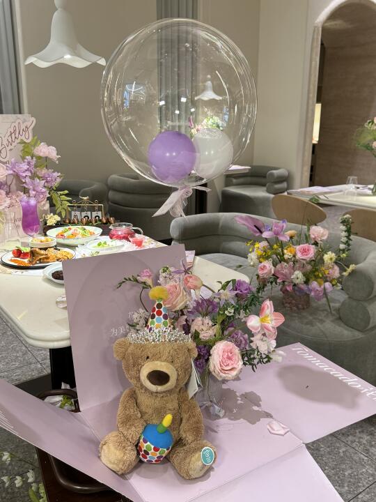- 超适合生日/纪念日的餐厅,餐厅布置很梦幻,被各种鲜花包围。这次女神节还有专属梦幻花桶,点生日套餐现场开花桶真的特别浪漫,气球飘出的瞬间狂拍一百张照片,还有会唱生日歌的小熊,仪式感拉满。