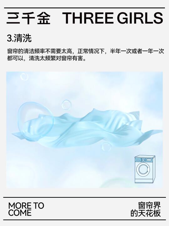 窗帘作为家庭内更换频率比较低的软装,日常的使用和保养同样需要多注意。 今天就分享一些平时我们需要注意的点: 1.褪色 尤其是西晒房的窗帘,要在窗帘的背后加一层防紫外线的镜面纱,纱+帘更能阻挡阳光直射 2.挂钩 尤其是西晒房的窗帘,害怕会褪色可以在窗帘的背后加一层防紫外线的镜面纱,纱+帘更能阻挡阳光直射 3.清洗 窗帘的清洁频率不需要太高,正常情况下,半年一次或者一年一次都可以,清洗太频繁对窗帘有害 那么今天的分享就到这里,想要了解到更多的窗帘可以移步主页查看! 三千金|窗帘界的天花板