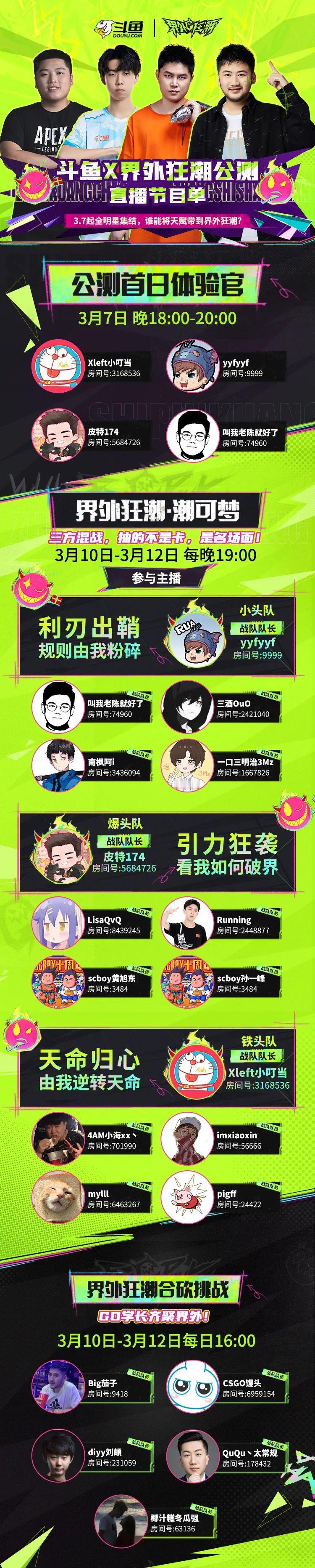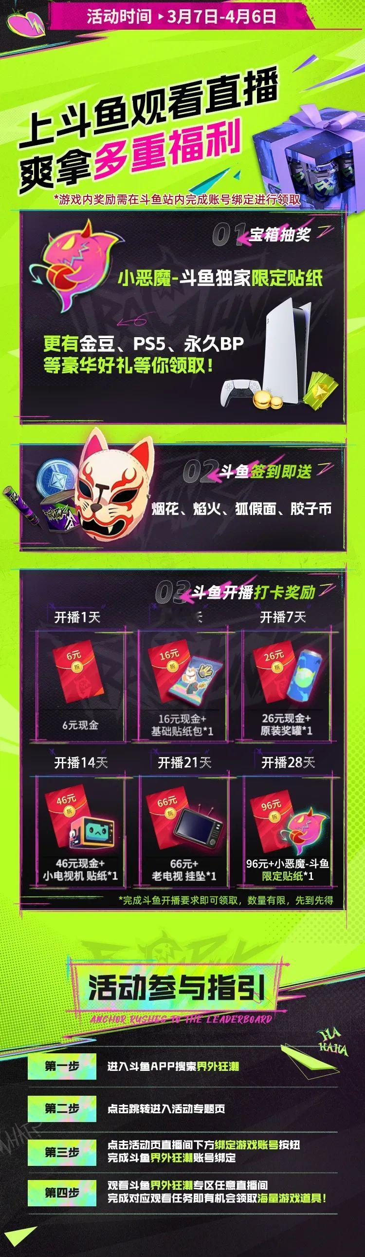 界外狂潮公测开启!3月7日-4月6日活动期间,上某鱼看播拿多重福利!更有超多精彩节目,海量游戏福利、实物好礼送不停!界外狂潮公测