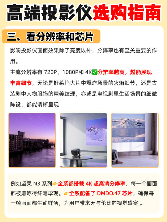 坚果N3系列全4K分辨率,DMD0.47芯片,AI超分辨率功能,老电影也能看高清画质。