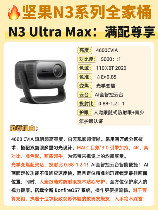 ✅坚果N3 Ultra:万元内旗舰!非常适合追求品质生活、喜欢大屏观影,又对智能体验有要求的家庭!