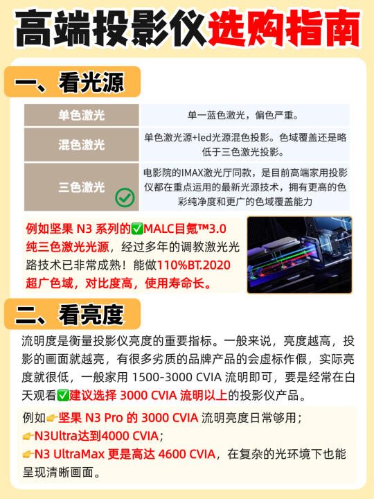 坚果N3系列的MALC目氪™3.0纯三色激光引擎,是IMAX影厅同款光源,高端,色域广、色彩准,技术成熟。
