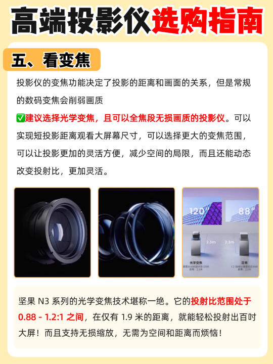 选择光学变焦,且可以全焦段无损画质的投影仪才高端!坚果N3系列投射比 0.88 - 1.2:1,1.9米投百吋,画质无损,安装灵活。
